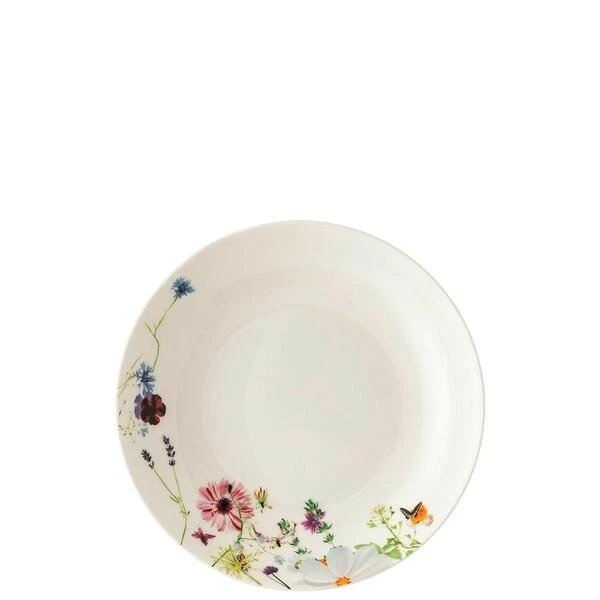 Der Suppenteller aus der Geschirrserie Brillance Bone China Grand Air von Rosenthal wartet bereits mit seinem prachtvollen Dekor aus Blüten auf die Chance, Ihre Suppe gekonnt in Szene setzen zu können. Hierbei wird Ihre dampfende Komposition spielerisch von den farbenfrohen Pflanzen umgarnt.