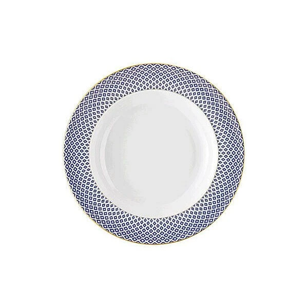 Mit dem Suppenteller der Geschirrserie Francis Carreau Bleu von Rosenthal werden Brühen und Suppen von klassisch verspielten Rauten umrundet. Das leuchtende Blau wird von weißen Freiflächen unterbrochen und mit einer goldenen Kontur abgeschlossen.